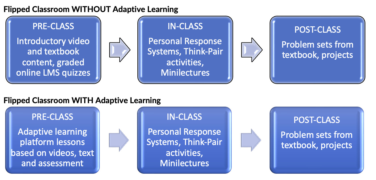 Given the limited research conducted on the use of adaptive learning in flipped classrooms and the success shown in the exploratory study24 by the authors of this paper, a fuller and more diverse investigation of the effectiveness of adaptive learning for pre-class learning in flipped classrooms is being conducted with two other universities by measuring changes in cognitive and affective impacts on the student.25