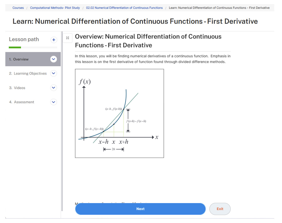 Each objective was then divided into individual lessons called nodes (Figure 2). There are 121 nodes for the whole course, out of which 70 fell in the pre-class learning portion of the flipped classroom. For example, we have two pre-class learning nodes for the “Numerical Differentiation of Continuous Functions” objective.