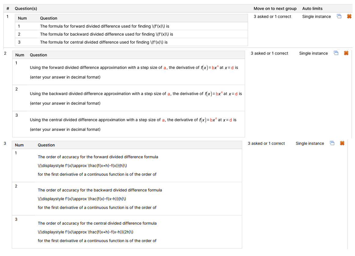 The last section of an ALP lesson is the assessment. The assessment design drives most of the success of any learning, including one that is adaptive in nature.32,33 Since there are 70 nodes in the course just for pre-class learning, the number of questions asked of a student in each node was kept limited. However, there is a need to have a pool of questions available if a student struggles to answer the questions correctly. For example, in the Numerical Differentiation of Continuous Functions – First Derivative node, the question grouping for the assessment is given in Figure 5. One question from each of the three question blocks is presented randomly to the student. Two blocks have multiple-choice questions worth 1 point each, and one has algorithmic questions worth 3 points each. Algorithmic questions have a static template but have variables that are assigned random numbers, which the ALP generates within a range chosen by the developer. Most times, algorithmic questions require more time and a higher level of understanding, hence being assigned more points than the shorter questions. The answers to the algorithmic questions are considered correct if they match the correct integer answer or are within ±1% of the correct non-integer answer. Since the ALP lessons are used only for pre-class learning, algorithmic questions with lengthy solutions are limited. However, after the student has answered an algorithmic question, they can see the final answer and several intermediate answers when warranted.