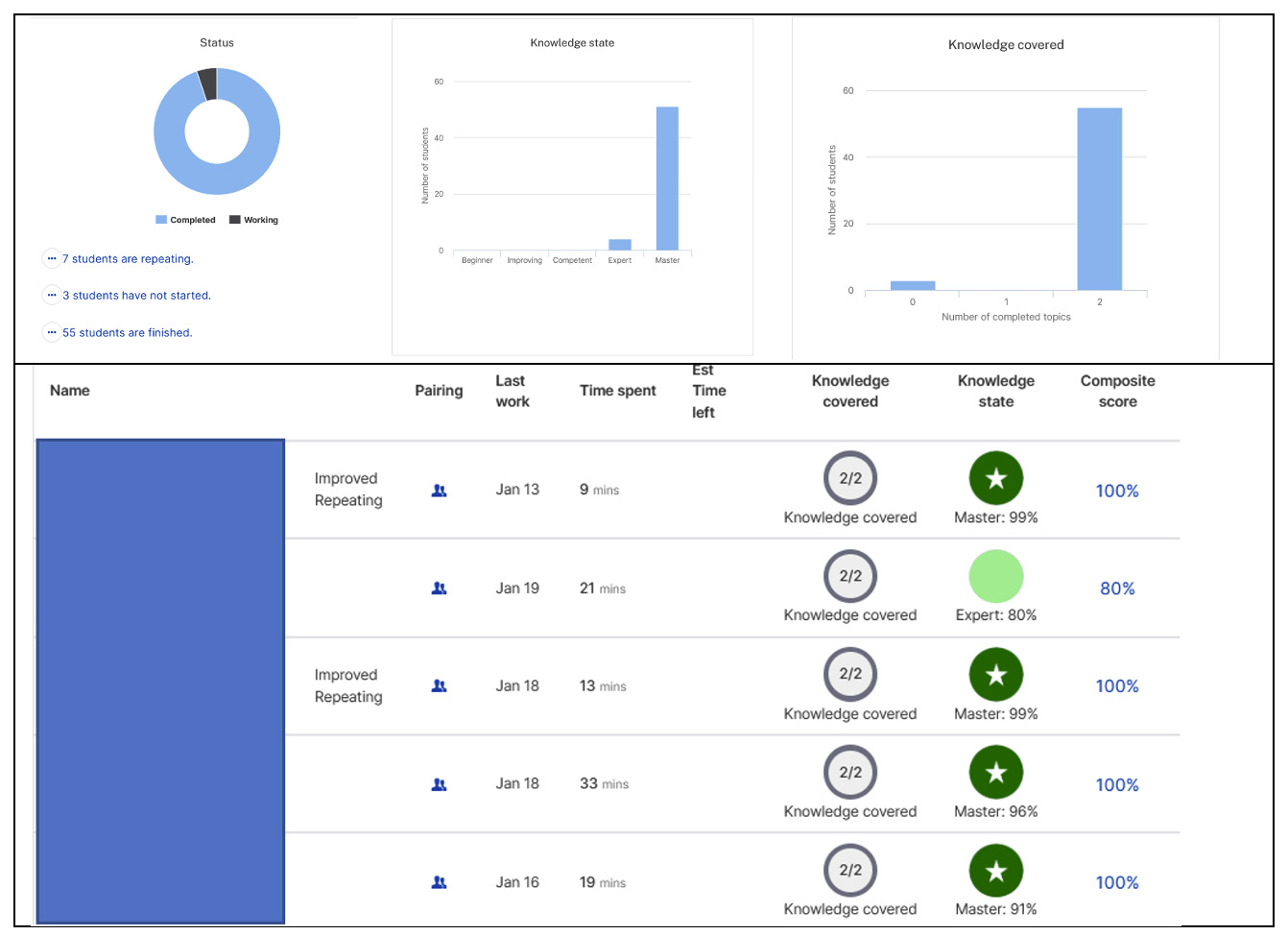 Other analytics available from the ALP include the names of students who have not started or are struggling, their knowledge state (i.e., how well they know the content), and the knowledge covered (i.e., how much content they had gone through). Those who are struggling or have not finished the lesson receive an email from the instructor encouraging them to seek help during office hours or, better, remain on schedule.