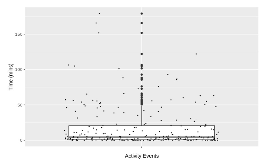However, it is essential to note that the reported individual activity times must be carefully interpreted. Many of these activities do not represent meaningful interactions between the student and the content. For example, students repeating the content in a node may quickly skip over the introduction and objectives sections and spend time on the text, videos, and questions, leading to times below our estimate for the node. Disproportionately long activity times may also be recorded if a student abandons the node but does not close the browser window.