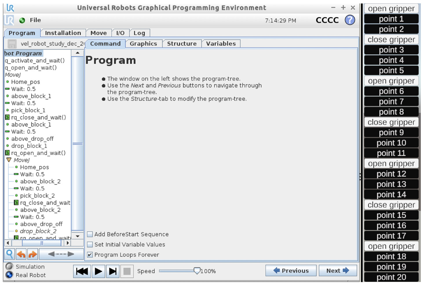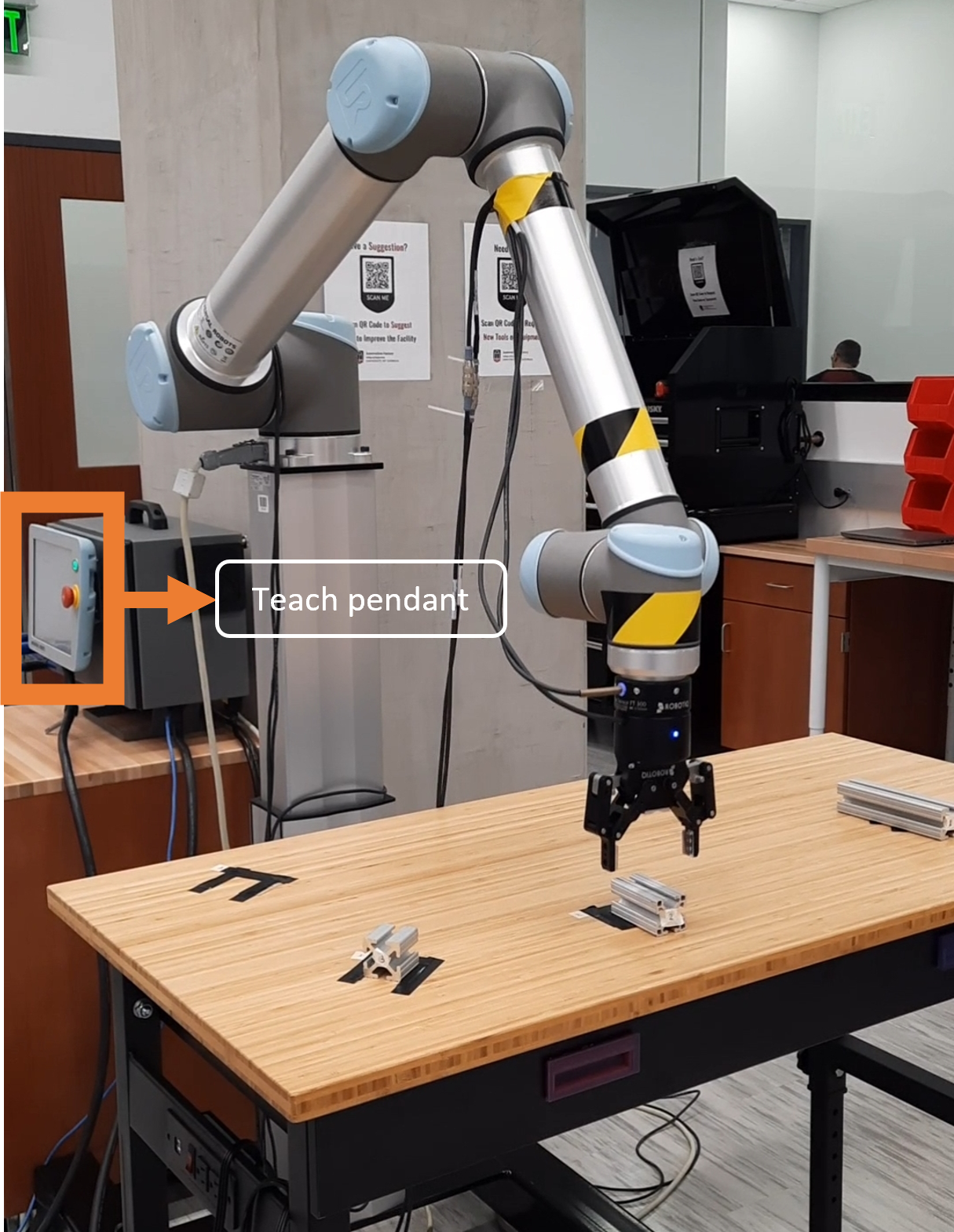 The researcher programmed a 6 degree of freedom (dof) UR10 industrial robot arm to demonstrate a pick and place task with three aluminum blocks. The UR10 robot uses a scripting language known as URscript which is very similar to Python programming language. The researchers created the program using the teach pendant shown in Figure 5a.