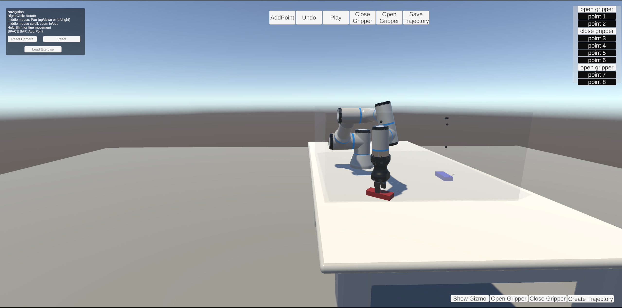 Figure 3 shows the available interfaces and the waypoints. The jogging interface allows the student to move the robot into specific positions, open and close the gripper and pull up the programming interface. This is similar to the controls available when programming a real robot where you can manually move the robot into different positions. The programming interface gives the student the ability to add points and actions to the robot trajectory, edit the trajectory, play back the trajectory and jump between poses of the robot in the trajectory. Finally, the navigation help menu provides an overview of how to navigate in the environment in addition to switching between tasks and resetting the scene and camera views.