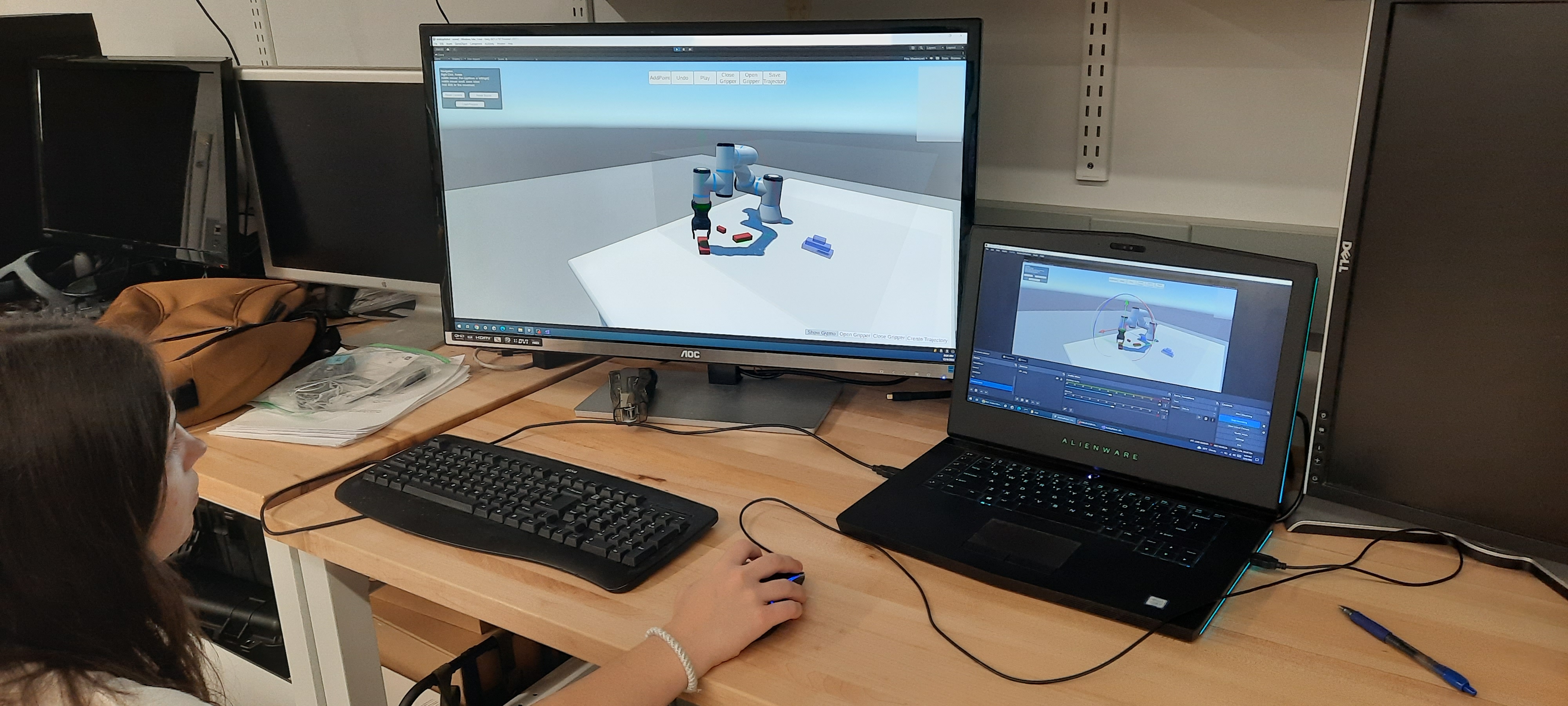 We implemented all the parts in the system so as to minimize the differences between the three sub-systems. It is worth noting that while high-end AR headsets such as those from Varjo come with premium prices and annual licensing fees, the AR technology landscape has rapidly evolved in the past few years. Notably, Meta’s release of high-quality AR headsets at sub-$500 pricing represents a significant shift, making AR solutions much more accessible. In our context, the primary expense lies in software development, as creating a high-fidelity virtual robot simulation requires investment in a VR software developer. However, this cost remains significantly lower than that of a physical industrial robot, making AR a more economically feasible and scalable option in the long term. As AR hardware prices continue to drop, we envision AR-based educational tools becoming more accessible to a wider range of institutions, enhancing their cost-effectiveness and sustainability as a solution for teaching advanced robotics. Furthermore, the development of PC-based digital simulations (like the desktop interface described below) could further improve the accessibility of these simulations.