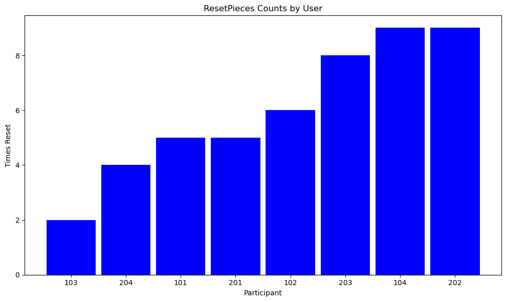 Overall, the application of the tool corresponded primarily to the success component of the MUSIC model, and secondarily to its empowerment component. Students’ perceptions of their ability to succeed were also aligned with their actual success to completing the research tasks. Figure 6 shows that different students needed different amounts of experimentation while using the program (“Reset Pieces” was the command each student used when attempting a new solution). Some students needed nearly ten attempts, while others needed only one or two. Regardless, every student eventually solved the problem they were provided, suggesting that the program’s design supported success for students with diverse incoming prior knowledge and preparedness.