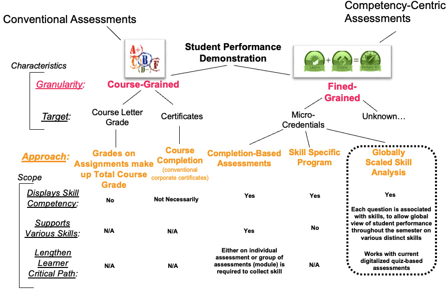 While micro-credentialing has gained traction and is an active area of research, various methodologies have been explored to achieve similar goals. However, these approaches often have limitations. A common challenge is the reliance on students completing skill-specific assessments or courses, which can be time-consuming for instructors to develop and for students to complete within their already demanding schedules. The taxonomy presented in Figure 1 illustrates multiple pathways for conducting detailed analyses and their respective roles in higher education.