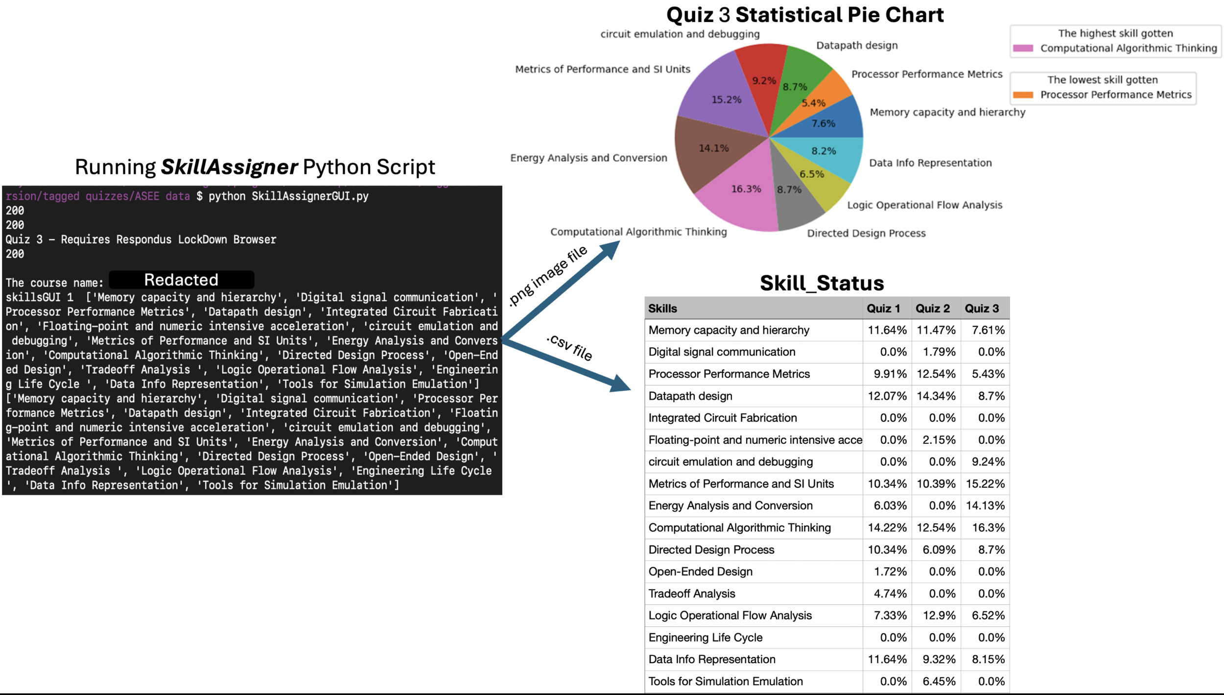 The Determination Phase: The SkillAssigner builds upon utilizing the API request to collect quiz statistics and the output from the MatrixMaker. The “SkillAssigner” was coined as the name of the second application that is continuously ran throughout the course of the semester for each assessment, as it follows the MatrixMaker after students have taken the given assessment. In the foundational work, the SkillAssigner was developed to data-mine the student statistics on performance for a given assessment, calculate the skills if any for each assessment, and output a matrix with each student and what skills they demonstrated (if any) for a particular quiz-based assessment. In addition, it provides instructors with data to gage the overall course performance with a list of students and their skills and an overall course performance trend data.