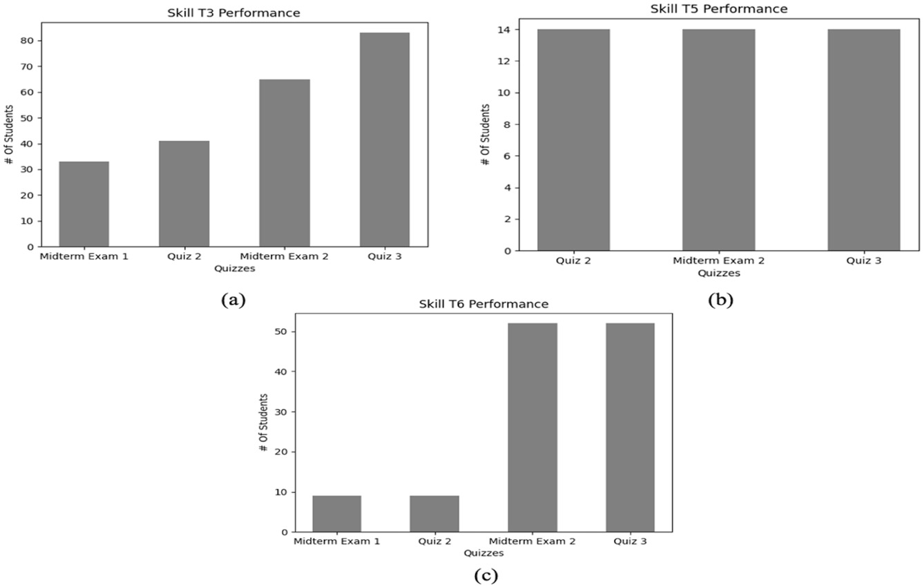 In Figure 5, three distinct patterns of skill development are observable among students as they progressed through the course. A linear acquisition trend is evident in skill T3 (Figure 5a), where student competency in this area increased uniformly throughout the semester. In contrast, skill T5 exhibits a front-loaded acquisition pattern (Figure 5b), where most students acquired this skill immediately upon initial coverage of the topic, with no further learners demonstrating it subsequently. This highlights an opportunity for instructors to target resources and support for enhancing student mastery of this skill in later course stages. Conversely, skill T6 displays a back-loaded acquisition trend (Figure 5c), where nearly all students acquired this skill at the end of the course. This finding suggests that providing additional resources or scaffolding earlier in the course may be beneficial to broaden student learning experiences and support future employer interests. Overall, the presented analysis via the AchieveUp toolset demonstrates how data mining of digitized assessments can provide valuable insights for instructors and employers alike.