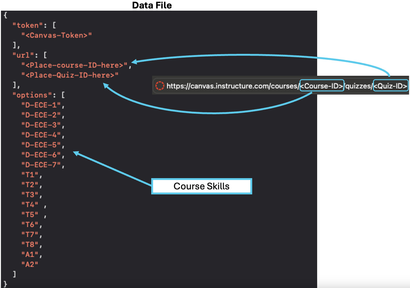 To prime the MatrixMaker, the instructor or teaching assistant must identify and specify badge names or labels, which are then fed to the MatrixMaker list of options to select from, when tagging individual questions. This step is essential in ensuring that the MatrixMaker is properly configured to identify and assign skills to student responses. As described within Figures 9 and 13, to access course and student data and tag questions, the instructor or teaching assistant must paste their token into the data file, assessment identification, and specify the list of achievable skills in the course.