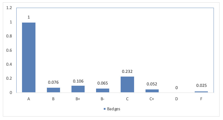 The micro-credentialing research was developed and tested through a couple semesters, and among that time, badge dispersal was implemented to reward high achieving students that deserve recognition on the skills they obtained in the course. Micro-credential badges give students something to look forward to throughout the semester as achievable goals, this also gives students with the ability to promote themselves in the industry to employers after acquiring digital badges from a course. In two separate semesters and observed that about half of the students were qualified enough to receive at least one badge to say they were proficient enough to claim proficiency in a particular part of the course material in the first semester. Building on the normalized statistical data from the grade-badge hierarchy presented in Figure 17, quantitative analysis revealed a statistically significant correlation between badge acquisition frequency and course performance. Specifically, students achieving “A” grades earned 62.2% of the badges. In contrast, those with “B+”, “B”, and “B-” grades collectively received an average of 16.9% of the badges.