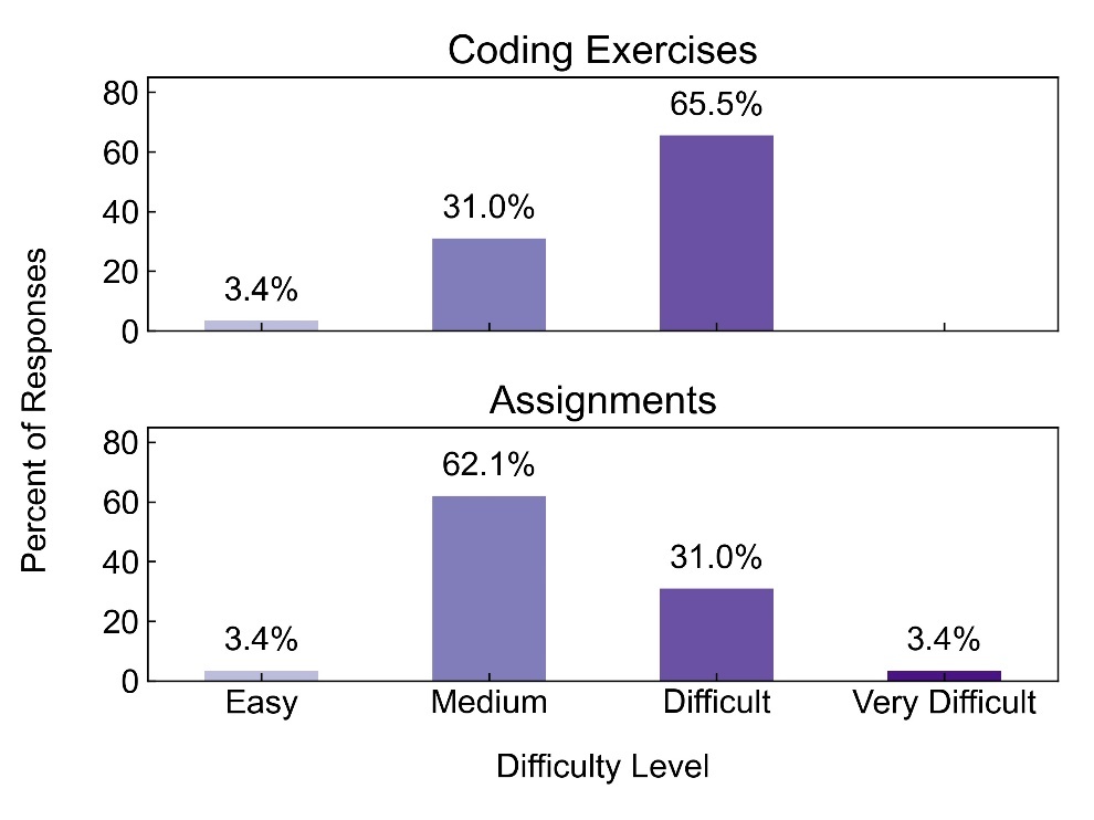 The Fall 2021 class was asked to rate the difficulty level of two typical upper assessment levels, i.e., a Coding Exercise and the coding portion of an Assignment, using four difficulty criteria: easy, medium, difficult, or very difficult. Data for this portion of the survey are not available for the Fall 2022 class. The results from this portion of the survey are presented in Figure 5 for the two stages of assessment.