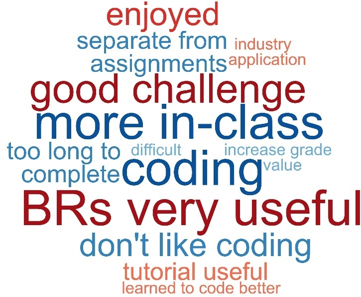Students also frequently commented about the low grade-value, steep learning curve, and lengthy completion time, particularly for beginners, to write a script to solve a problem, mainly referencing the assignments. The grade value to the overall coding portion of the course was increased from 8% to 10% in Fall 2022, which, in combination with the in-class coding session, appears to have resolved this concern. For clarity, the contribution to the coding portion from the assignment (1% per assignment), remained the same, while the total value of the Coding Exercises increased from 4% (1% per CE) to 6% (1.5% per CE). Students found the BRs quite useful as a self-study tool and felt that the sequence of coding incorporation in the course was effective.
