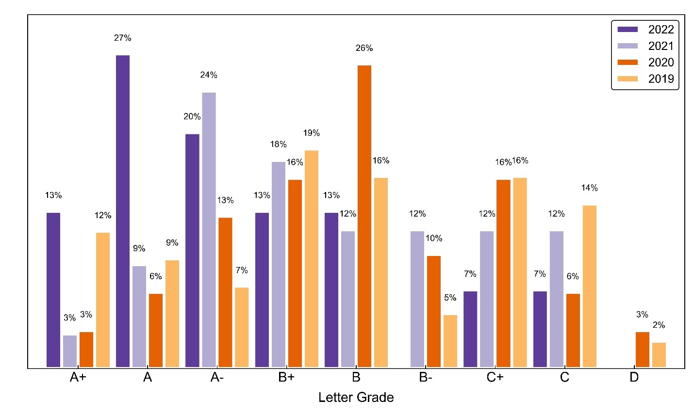In general, the distributions of the grades are quite similar for all four offerings, with a few notable exceptions. There were fewer students achieving final grades of A and A- in 2019 and 2020, prior to the introduction of the coding component to the course, and more students achieving grades of B and C+. The class averages (not shown in Figure 7) do not show much variation from year to year, with the letter grade ranging from a B to B+ (72-78 %) in all four years, i.e., 72 % average in each of 2019 (43 students) and 2020 (31 students), 74% average in 2021 (34 students), and a 79% average in 2022 (15 students).