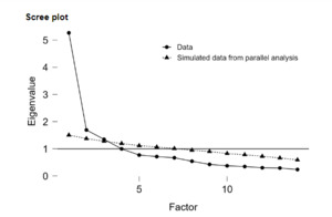 The EFA procedure requires the researcher to first determine if EFA is the most appropriate tool with respect to the research goal (Fabrigar et al., 1999). The goals of our research study include determining the underlying factors represented by the items in the survey instrument, and hence, EFA was found to be appropriate. The number and soundness of measured variables included in the study play an important role (Cattell, 1978). It is recommended that each factor be represented by a minimum of 3-5 measured variables (Fabrigar et al., 1999), and this has been satisfied in our study. Descriptive statistics, including mean, standard deviation, skew, and kurtosis, were calculated to assess the normality of the data. Kaiser-Meyer-Olkin (KMO) test and Bartlett test of sphericity were used to check the suitability of data for the EFA procedure (Field, 2009). A KMO value greater than 0.8 indicates sufficiency for sampling, and a significance value less than 0.5 for the Bartlett test of sphericity ensures the correlation matrix is not an identity matrix (Hair et al., 2019). In order to determine the number of factors, eigenvalue criteria were used in JASP software, retaining only factors that had an eigenvalue greater than one as obtained in the scree plot. See Figure 2. EFA requires the researchers to pick an appropriate extraction method and rotation. Maximum likelihood extraction is accurate for distributions that are close to normal with skewness < 2 and kurtosis < 7. Promax, an oblique rotation was utilized that allows correlations among the different factors (Hendrickson & White, 1964).