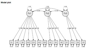 An overall KMO value of 0.86 indicates that the dataset used in this study is appropriate for performing EFA and identifying reliable factors. Table 2 shows the results of the three-factor analysis. Bartlett’s Test result with a chi-squared value of 1043.588, degrees of freedom (df) of 91, and significance level of less than 0.001 indicates that the variables are related and the dataset is suitable for factor analysis. A scree plot shown in Figure 2 suggested retaining three factors that had eigenvalues greater than one. The three factors can be seen in Table 2. The measurement model plot in Figure 3 shows the mapping of the questions to the factors.