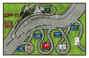 To make the framework transparent, we provided a visual Course Map (Figure 1). The “highway” lanes represented the required core assignments, completion of which earned a grade of C. Additional “side lanes” represented optional assignments that could elevate a student’s grade to a B or A. This design communicated that success required first demonstrating competence in the core areas, but students could individualize their path beyond that baseline.