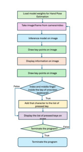A virtual keyboard with an intuitive on-screen interface was developed to enable text input through hand gestures. Upon initialization, an empty character list is created to store user input. Keypress detection is based on tracking keypoints 8 and 12, corresponding to the index and middle fingertips, respectively. A snapshot of the virtual keyboard interface is shown in Figure 5 (b). Figure 6 depicts the keypress detection logic.